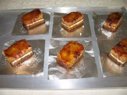 Es baten els ous amb el sucre quan sigui ben esponjós si tira el polsim vainilla i seguidament i posarem la farina passada per el sedàs i la llevadura en pols barrejant amb molta cura perquè no s'abaixi el batut, després u posarem amb una plata rectangular una mica fonda per exemple dels canelons i la posarem al forn a 180º aproximadament uns 30 minuts. Mentrestant prepararem l'almívar amb 250 gr. sucre i 250 gr. d'aigua quan hagi bullit una mica el retirarem del foc perquè se refredi, amb les cuatre yemas d'ou i uns 50 gr. d'aquest almívar el posarem al foc lent sense que bulli i quan s'espesseixi el traurem del foc i el posarem en una plata que refredi dons servirà per cremar els borratxos. Quan tinguem la plancha de bescuit cuita i frreda la tallarem a tiras de 4 cm. d'ample per 8 cm. de llargada aproximadament es poden fe mes petits o mes grossos al gust. Agafarem l'almívar i li barrejarem la ratafia u posarem en una plata fonda perquè puguem mullar els bescuits, després intenteu pugue escorre amb una rejilla, seguidament agafareu la yema i la untareu pel damunt dels borratxos i tireu un polsim de sucre i amb una pala de cremar la crema els cremareu, els podeu presentar amb paper de plata si voleu. Si us agrada també podeu fe partint la planxa per la meitat i untarla amb crema de mantega que trobareu a la recepta de la Sara Mora li dona un gust molt especial. Els nostres borratxos eren el deliri de molts clients con en Ramon B.,l'Esteba, la Mercè G., la Dolors i l'Olga, en Joaquim P. en Sisu P. en Lluis J. en Jordi A. i la Rosa i molts d'altres. |